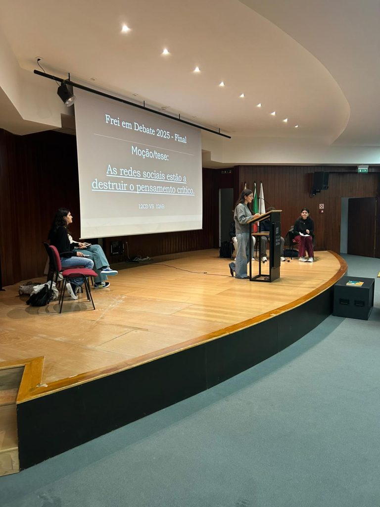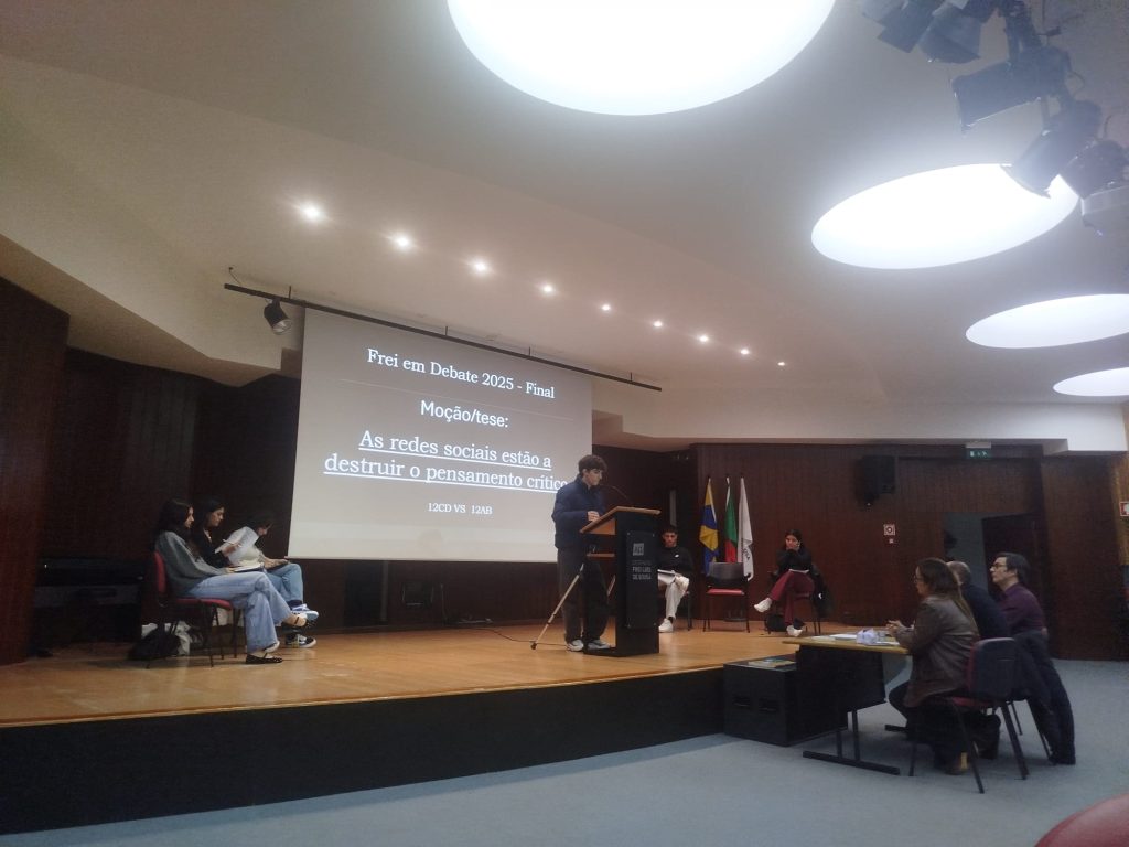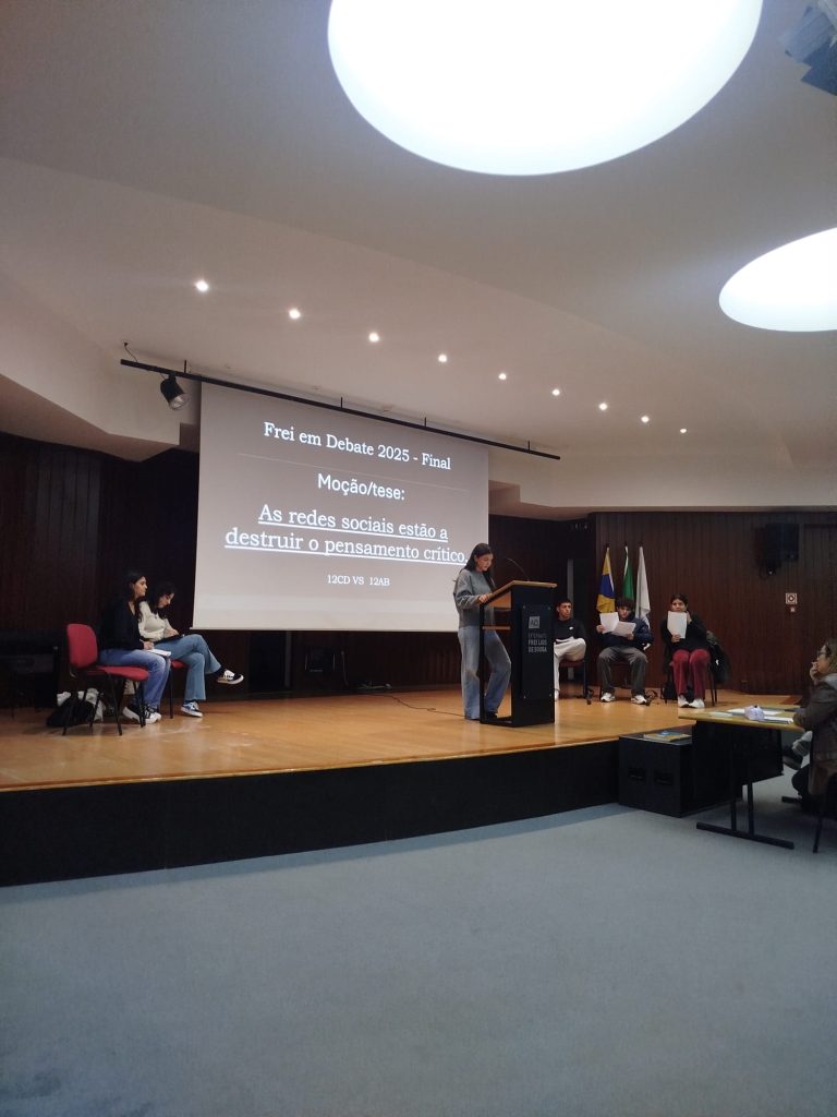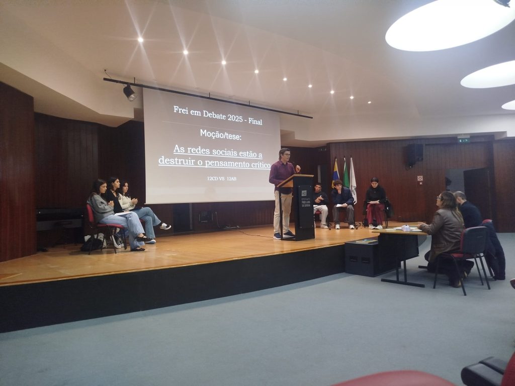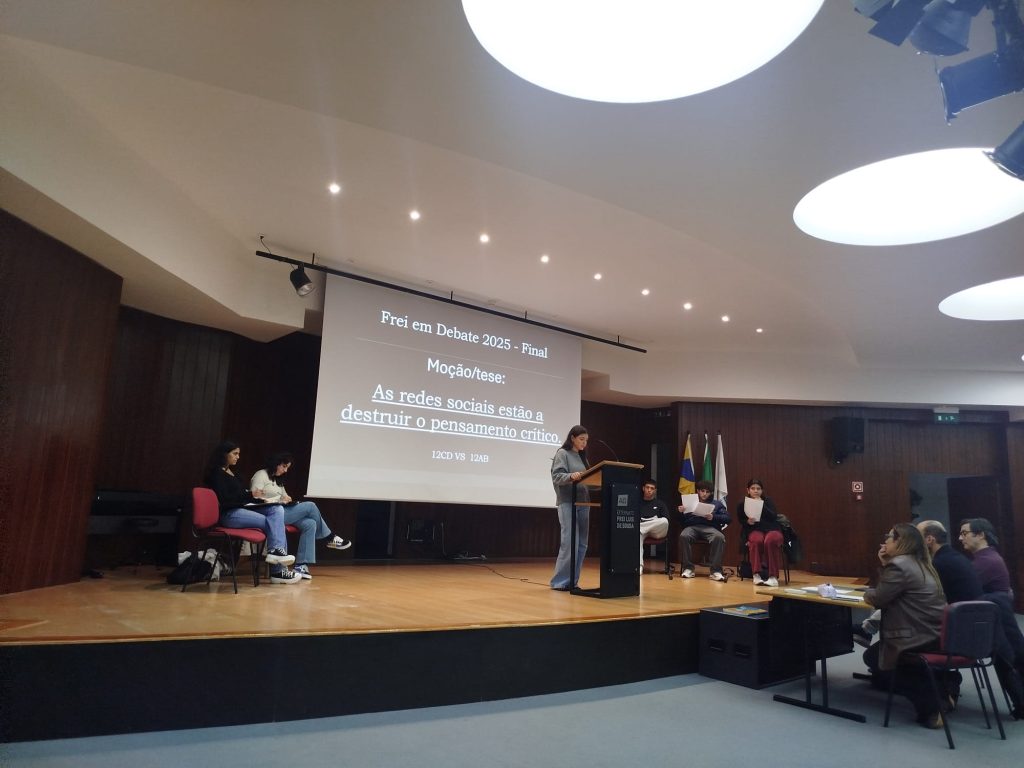 Realizou-se, no dia 17 de novembro, no auditório da nossa escola, a finalíssima de um torneio de debates que se iniciou em janeiro deste ano e que culmina agora entre os representantes dos 12º anos sob o tema seguinte: “As redes sociais estão a destruir o pensamento crítico.” Este evento além de terminar agora um processo interno de debates entre as várias turmas do ensino secundário servirá para apurar quem irá defender e representar o Frei num torneio, a nível nacional, de debates organizado pela AEEP que se realizará no mês de fevereiro de 2026. Mais uma oportunidade de se fazer democracia e desenvolver o espírito crítico na nossa comunidade escolar. Parabéns a todos os intervenientes!