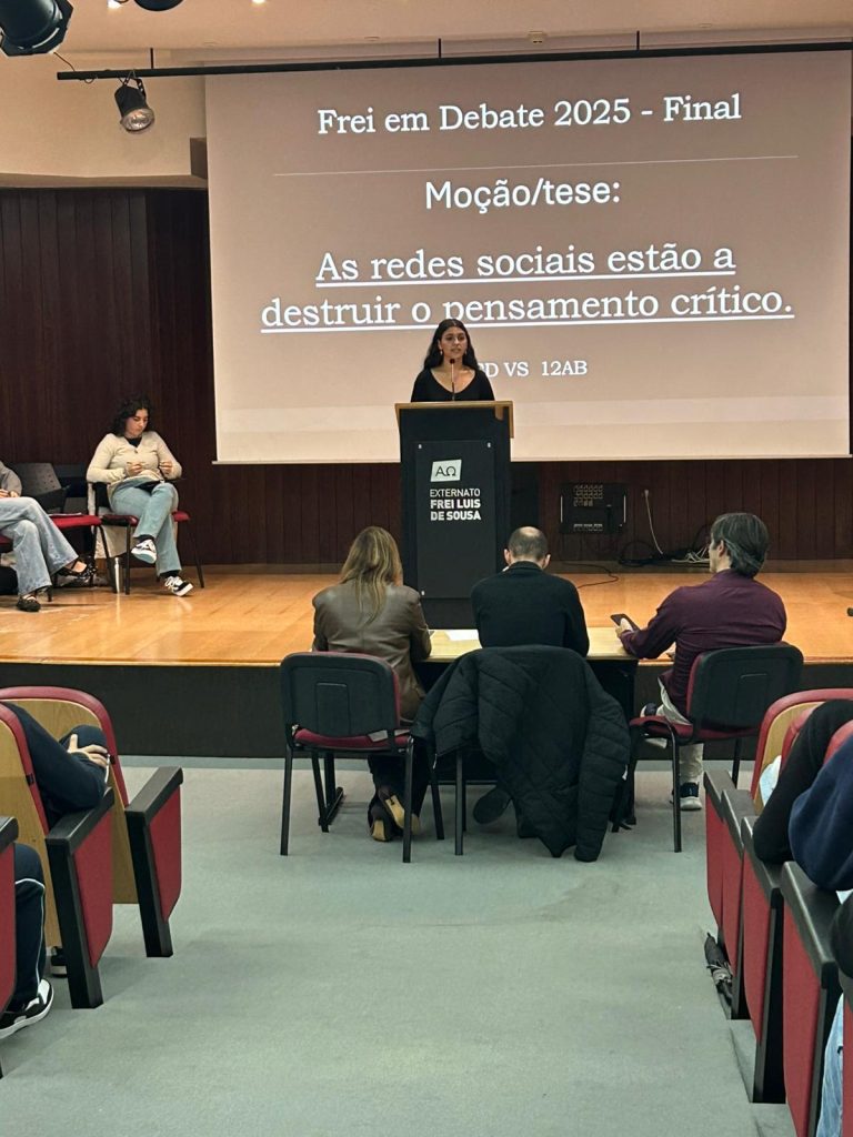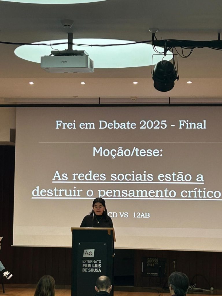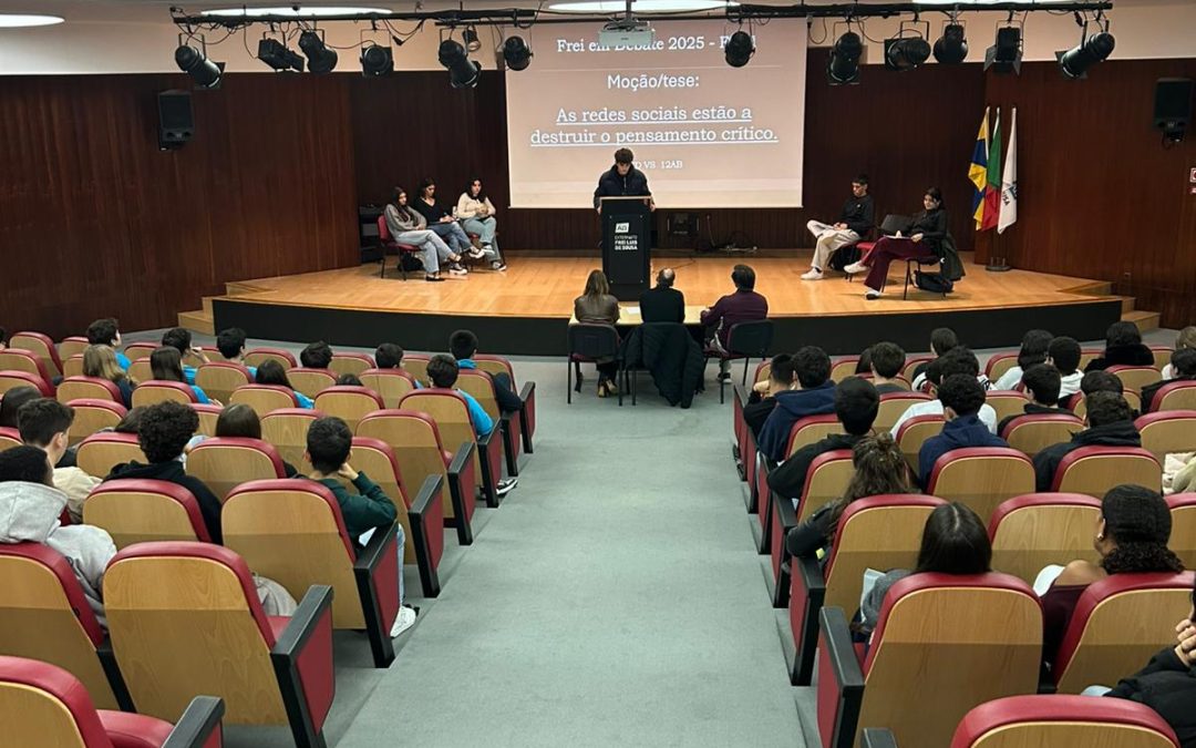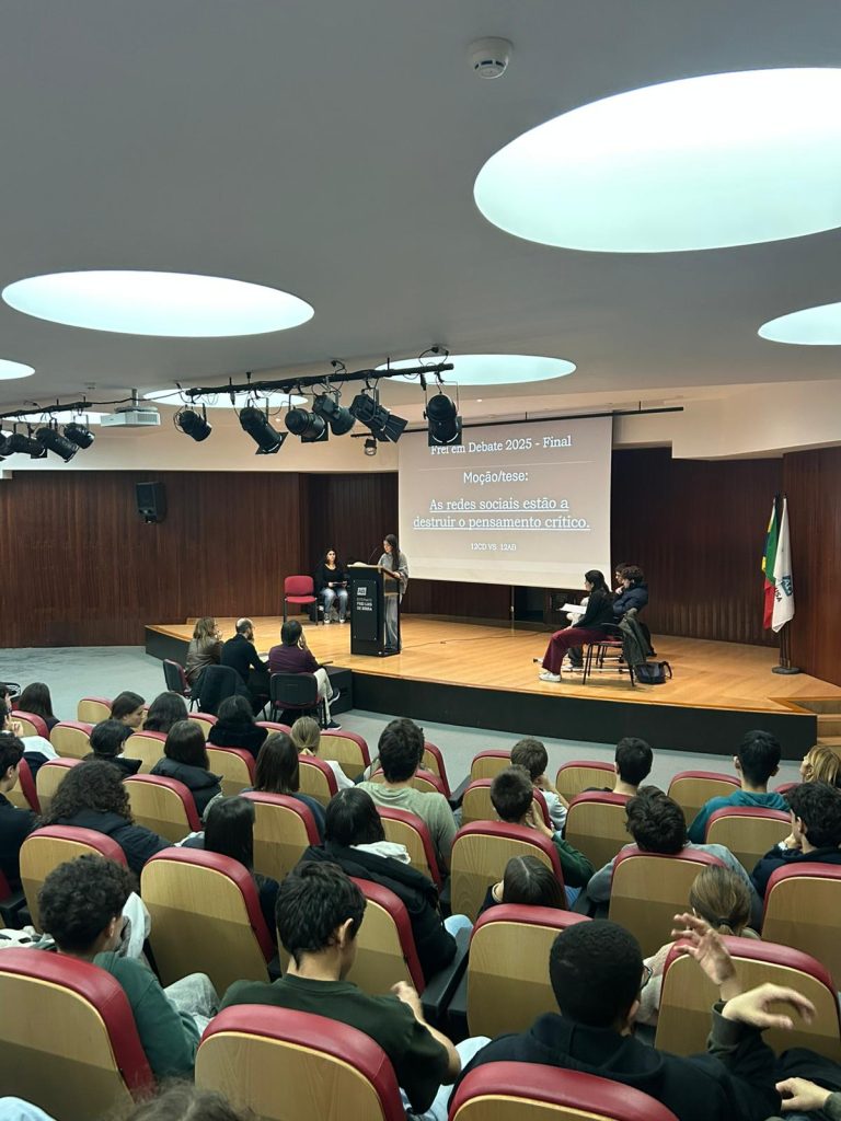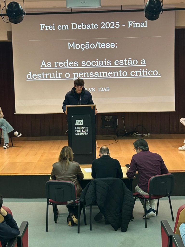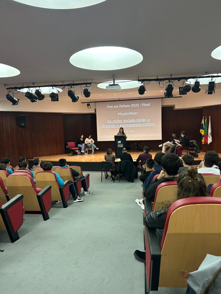 Realizou-se, no dia 17 de novembro, no auditório da nossa escola, a finalíssima de um torneio de debates que se iniciou em janeiro deste ano e que culmina agora entre os representantes dos 12º anos sob o tema seguinte: “As redes sociais estão a destruir o pensamento crítico.” Este evento além de terminar agora um processo interno de debates entre as várias turmas do ensino secundário servirá para apurar quem irá defender e representar o Frei num torneio, a nível nacional, de debates organizado pela AEEP que se realizará no mês de fevereiro de 2026. Mais uma oportunidade de se fazer democracia e desenvolver o espírito crítico na nossa comunidade escolar. Parabéns a todos os intervenientes!